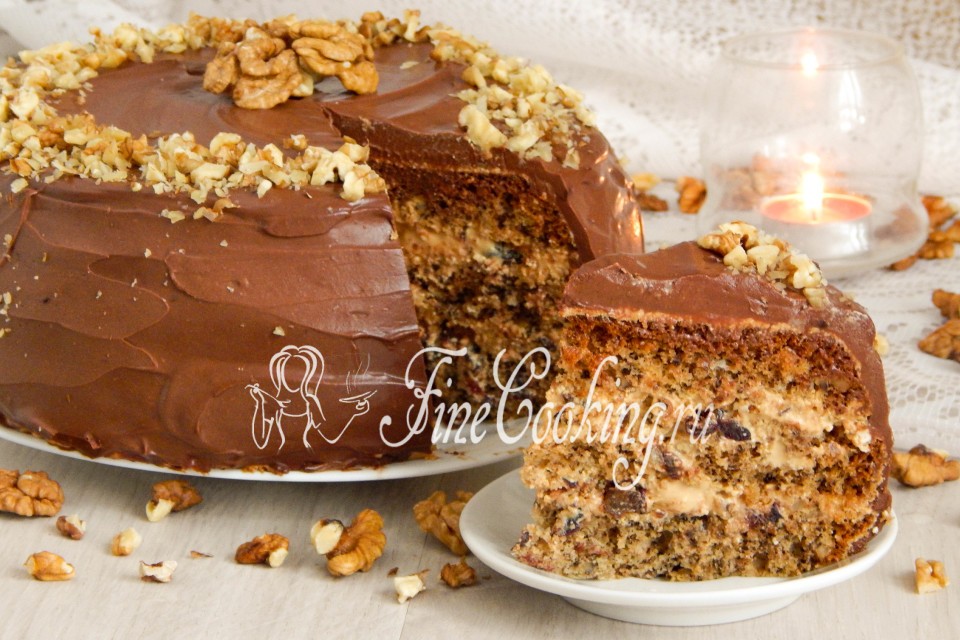 We decorate the finished cake, as fantasy will allow. I didn’t invent anything, but sprinkled the cake on top with chopped walnuts. Before serving, the cake needs to be given a little more rest in the cold, so that the icing grabs — literally an hour.