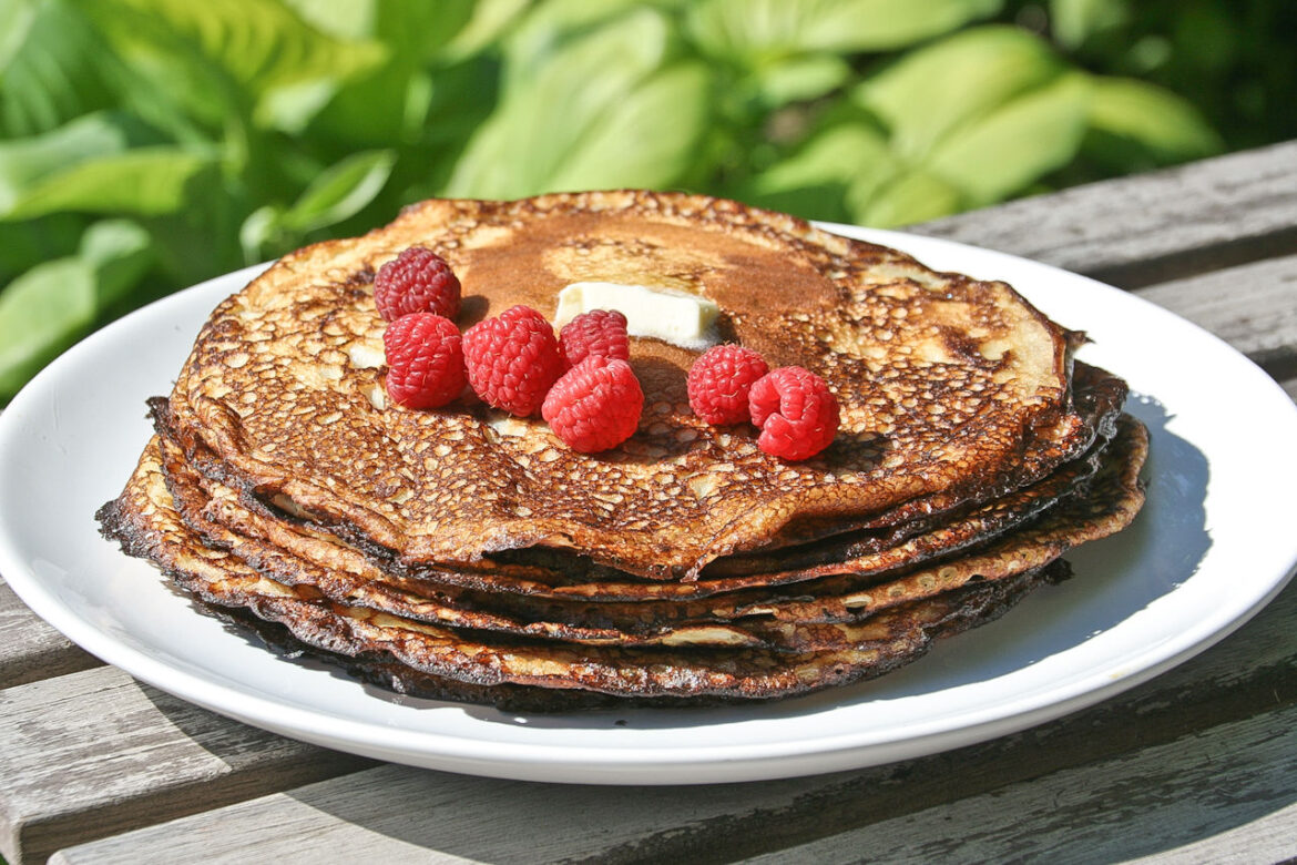 While the first pancake warms its second block, add a little oil to the first pan, if necessary, pour the dough again, we think. In the thirtieth second, we shift the finished first pancake to the prepared plate (also just turning the pan), check the second pancake for the wisdom, we count and so on.