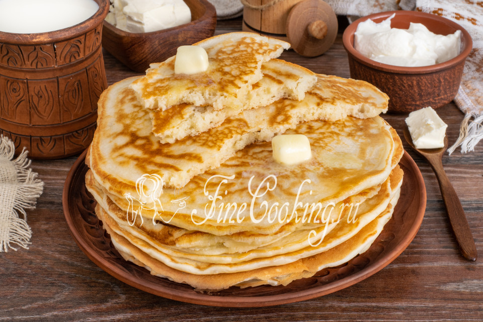 To prepare fluffy yeast pancakes, we need the following ingredients: milk, wheat flour, chicken eggs, butter and vegetable oil, sugar, yeast and salt.