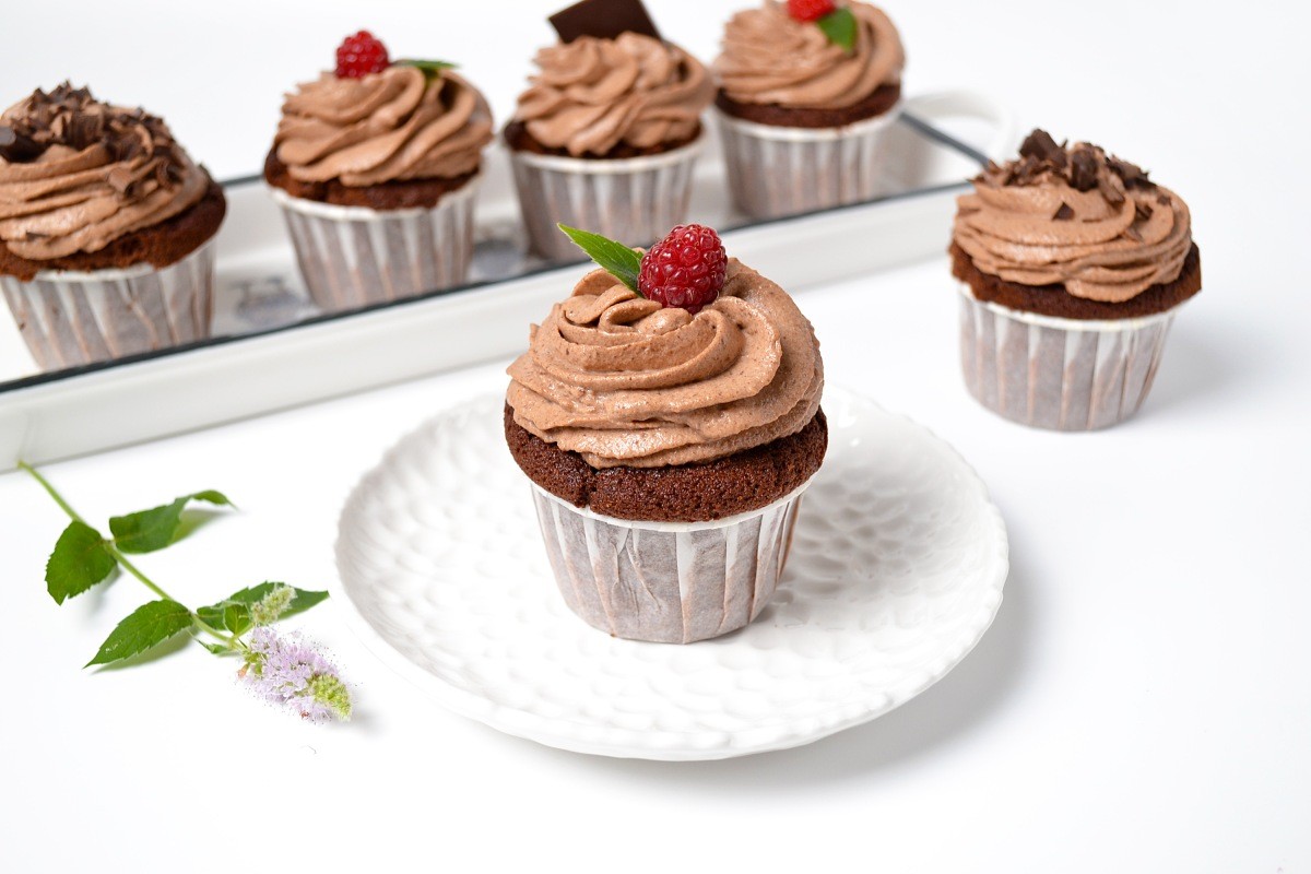 Chocolate cupcakes at home are ready. Decorate to taste. I used raspberries, mint and natural chocolate. You can immediately serve to coffee or tea.