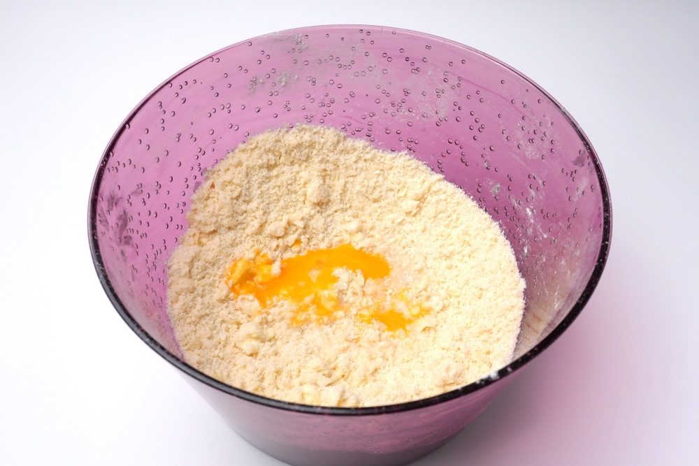 Add cold yolk and ice water to the crumbs. Mix everything quickly.