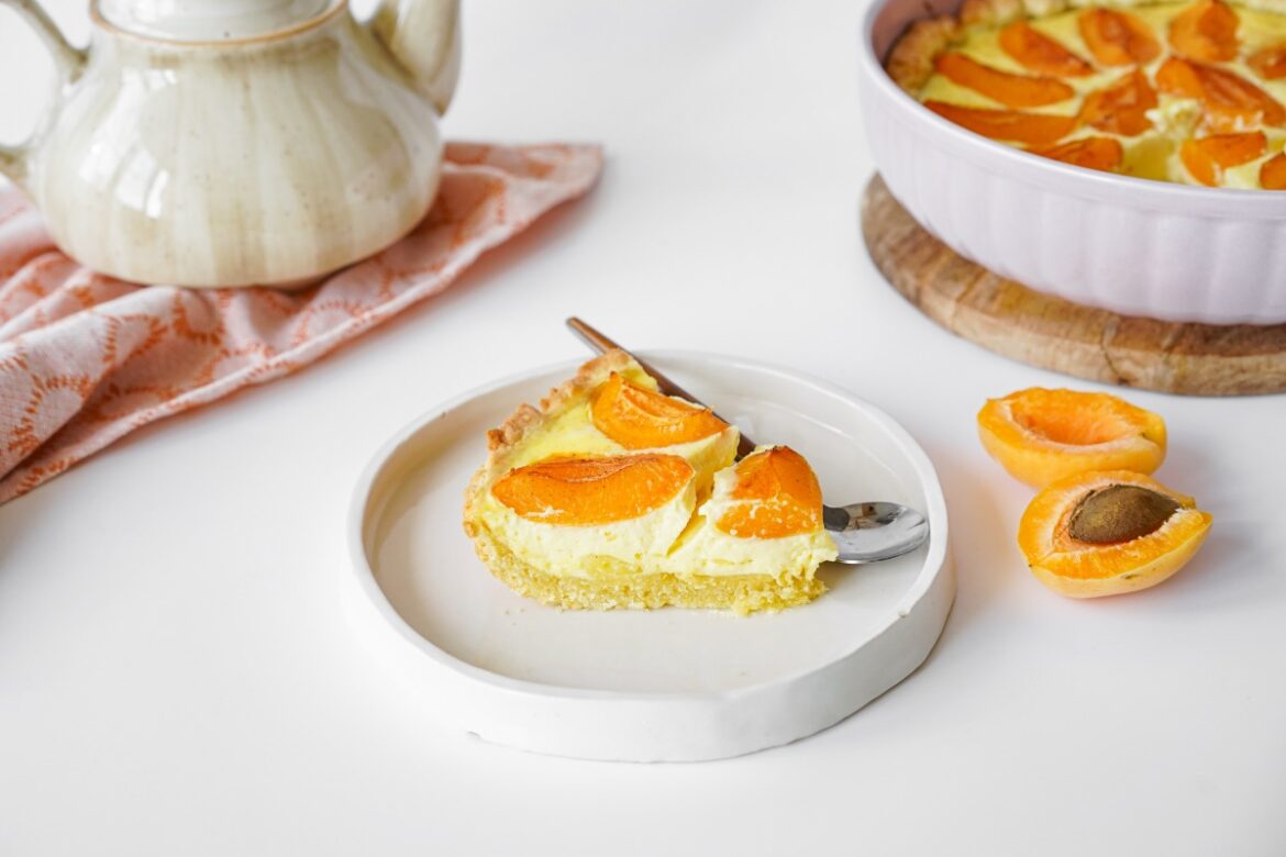 Cut it into portions with a sharp knife. At the exit, you will get a pie with crispy, melting edges, juicy aromatic apricots and a velvet creamy middle. The sand dough is pleasantly crumbling under the fork, and the sour cream flood is pleasantly melting in the tongue. The taste is bright, but not sugary, with a shade of vanilla, fruit sourness and natural oilyness.