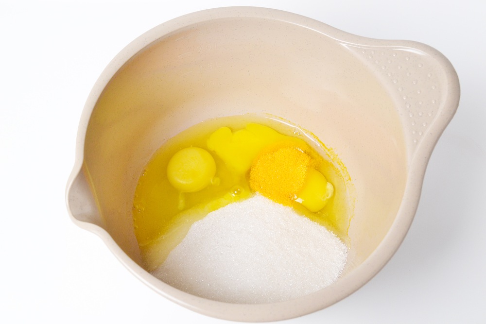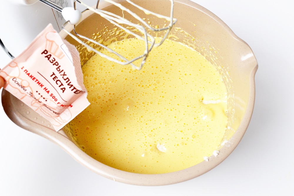 In a deep bowl, combine eggs, sugar, vanilla sugar and salt. Beat into a dense mass that will increase in volume. First beat at medium speed for about 2 minutes, then at maximum speed for another 3-4 minutes.