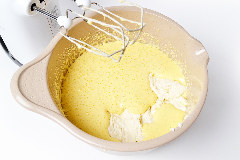 Turn on the oven at 200 degrees. Add the swollen semolina to the eggs and mix again with a mixer at low speed for about 1 minute.
