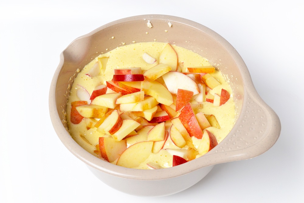 Place the apples into the batter and stir with a spatula until each piece is coated.