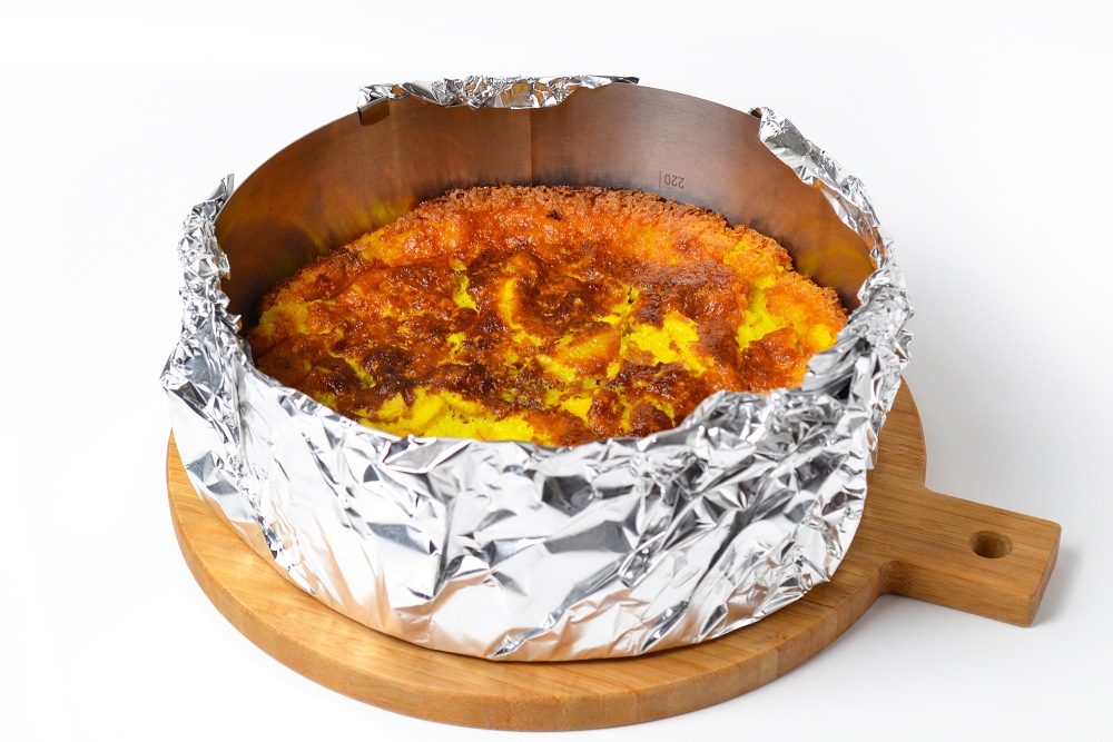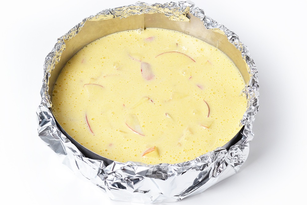 Pour the dough into a mold with a removable bottom. I use a diameter of 24 cm. You can use a pastry ring, like mine, securing 1-2 layers of foil at the bottom. It’s convenient to immediately place the ring with foil on a baking sheet so that you don’t have to move it.