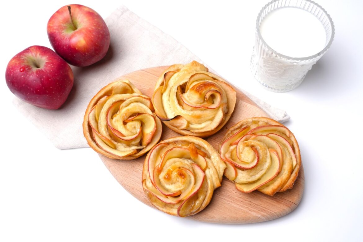 Bake puff roses in the oven at 170 degrees, low setting only. If you turn on the top heat, the apple petals may burn, and the dough will not have time to bake.