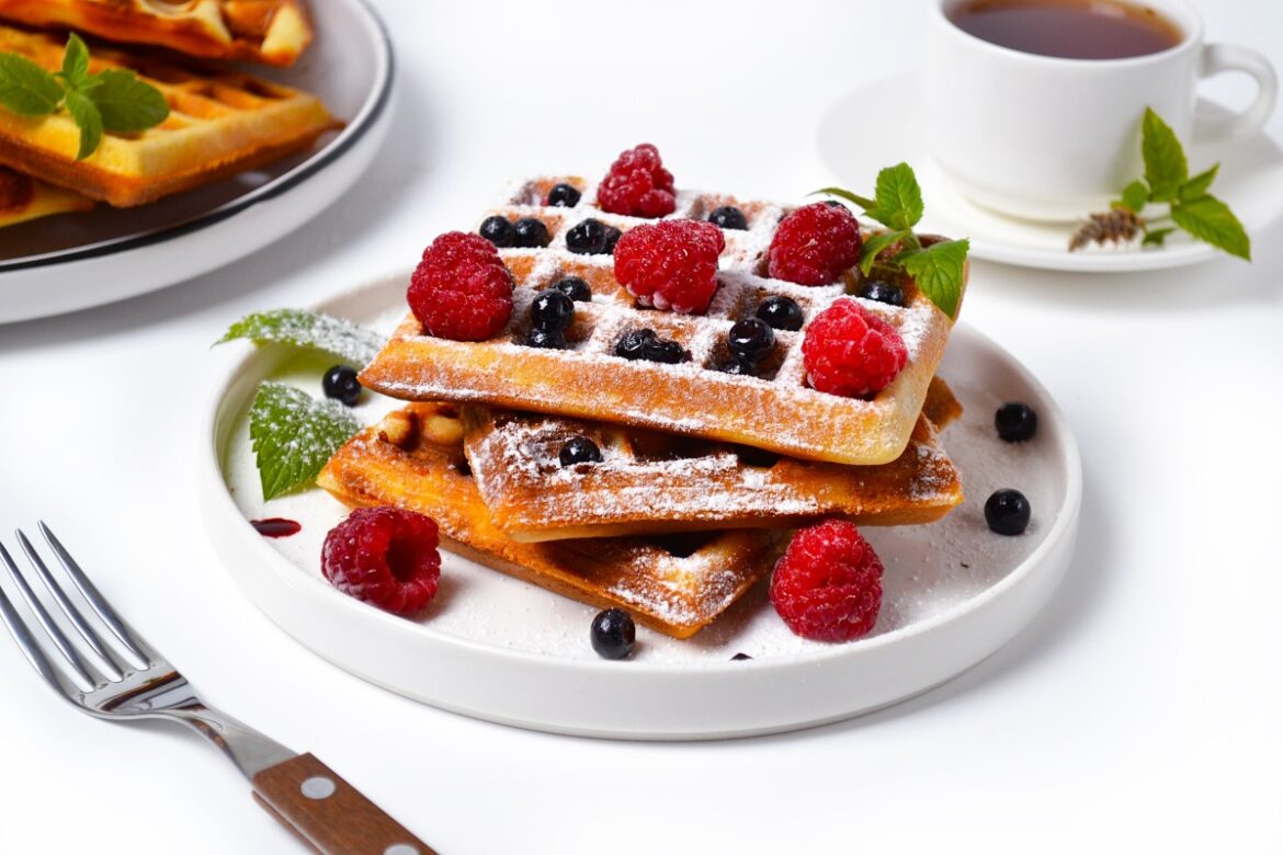 When the waffles become slightly warm, serve them with whatever your imagination dictates. Today I serve defrosted raspberries and blueberries, as well as a little powdered sugar. Enjoy your tea!