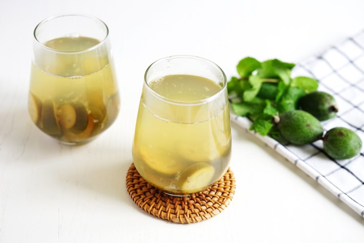 Mint for compote can be used optionally. I really like the combination of mint and Feihoa. It gives compote to light freshness in taste. You can remove the mint or replace it with a branch of fresh thyme. Feihoa has a very neutral taste and is perfectly flavored with additional herbs. It is very tasty to add orange or lemon slices to the compote. Try to use a cinnamon or anisa stroke.