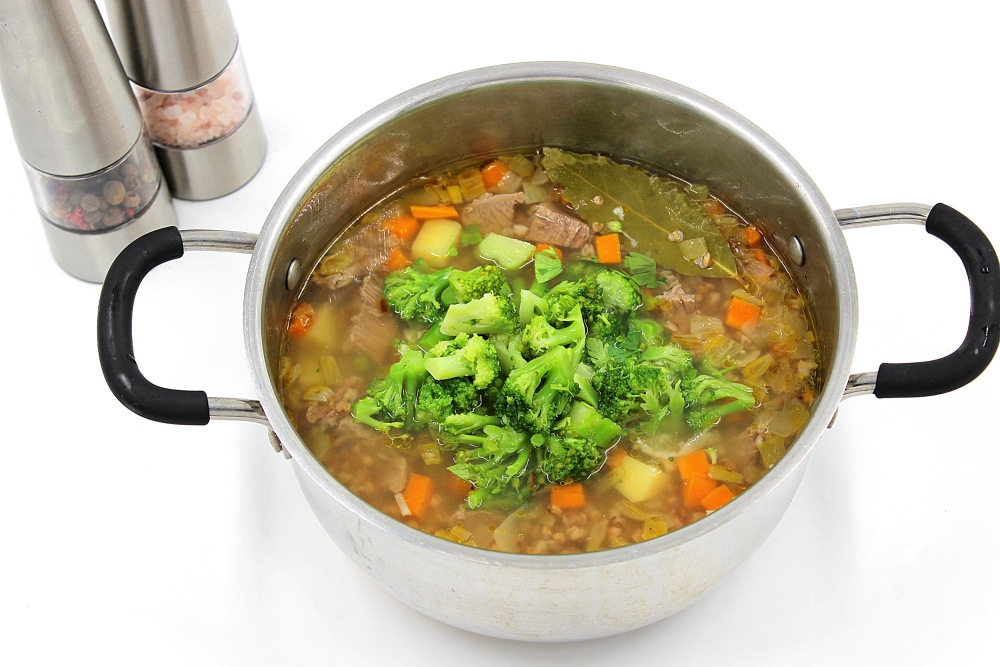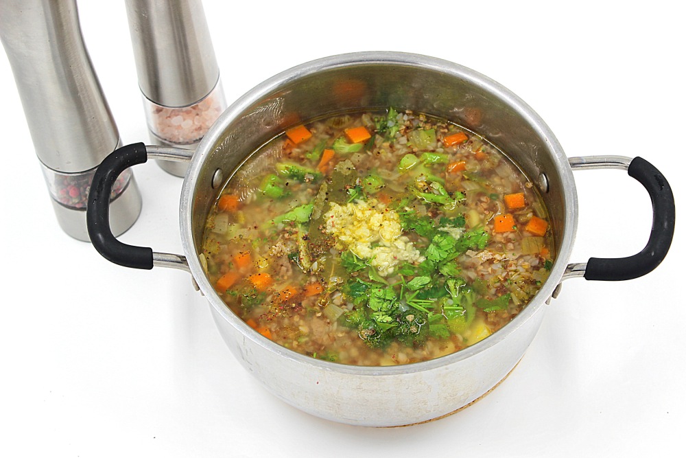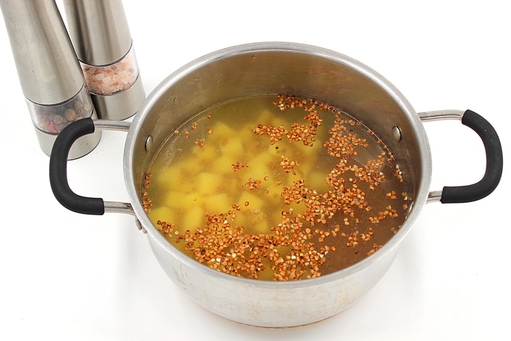 Add buckwheat, potatoes, a teaspoon of salt to the broth and cook for 10 minutes.