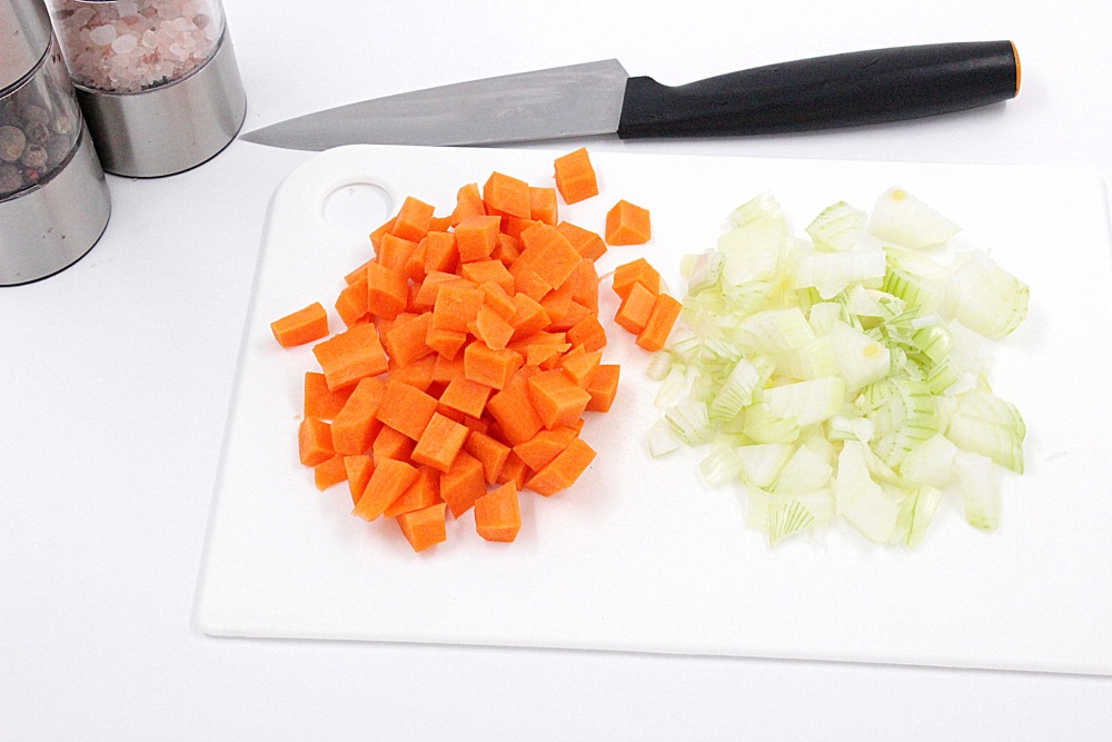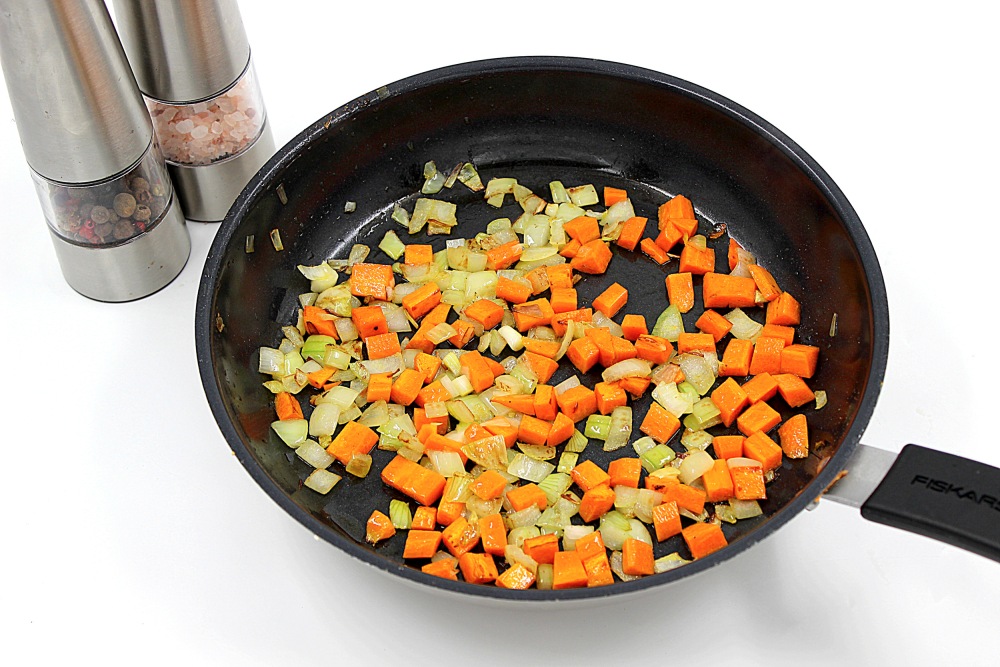 Add a spoonful of olive oil and fry the onions and carrots for 3-4 minutes over medium heat.