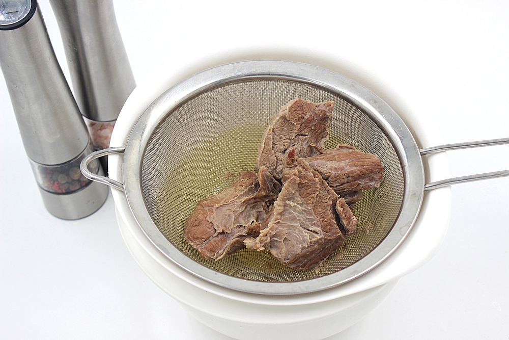 Once the meat is ready, place a sieve on a bowl and drain the meat, strain the broth.