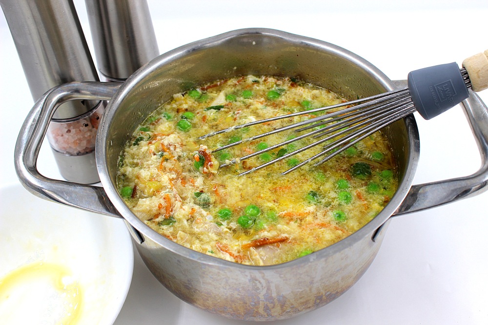 Step 10Pour in the eggs in a thin stream, stirring continuously. It's like making a continuous funnel and slowly pouring in the eggs.