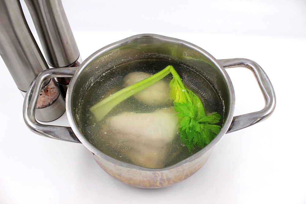 Step 2Place the chicken in the water, add salt, add celery and cook for about half an hour. After it boils, remove the resulting foam. Watch the master class “HOW TO SPEND NO MORE THAN 1 HOUR A DAY IN THE KITCHEN AND AT THE same time feed everyone tasty and healthy”👉🏻HERE