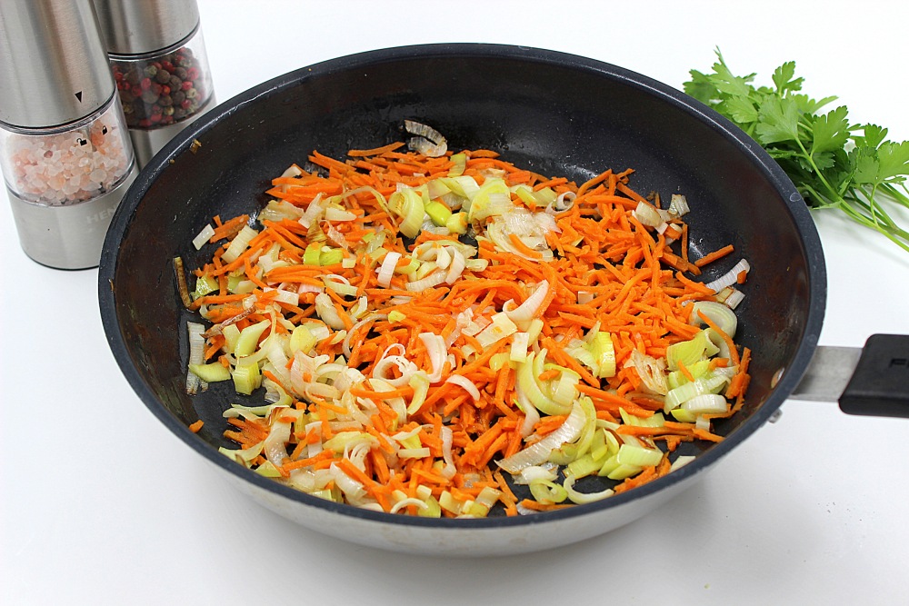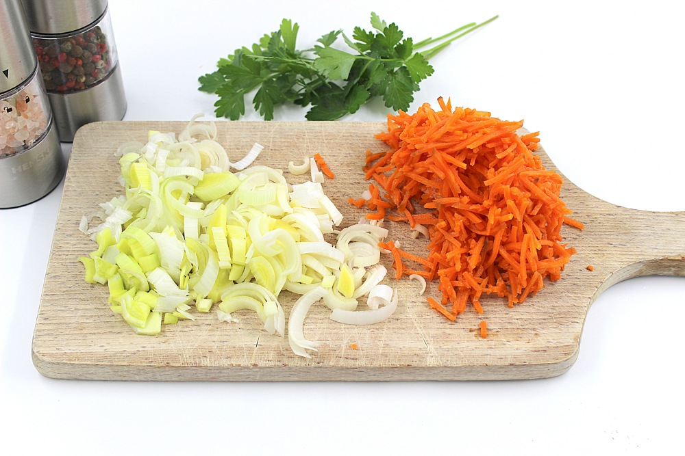 Step 3Finely chop the onion into half rings and grate the carrots.