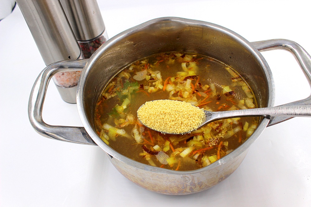Step 11Turn off and let the curly chicken soup brew under the lid. Taste for seasoning. The couscous has steamed, which means it’s ready.