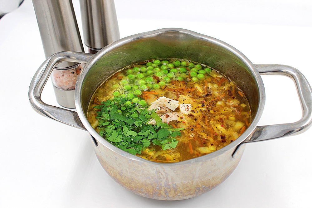 Step 9After this, greens, peas, chicken and pepper. Bring to a boil. I don’t cook green peas for a long time; I like them to stay fresh. 1-2 minutes is enough. If you want something more tender, add it along with the frying. You might be interested in: