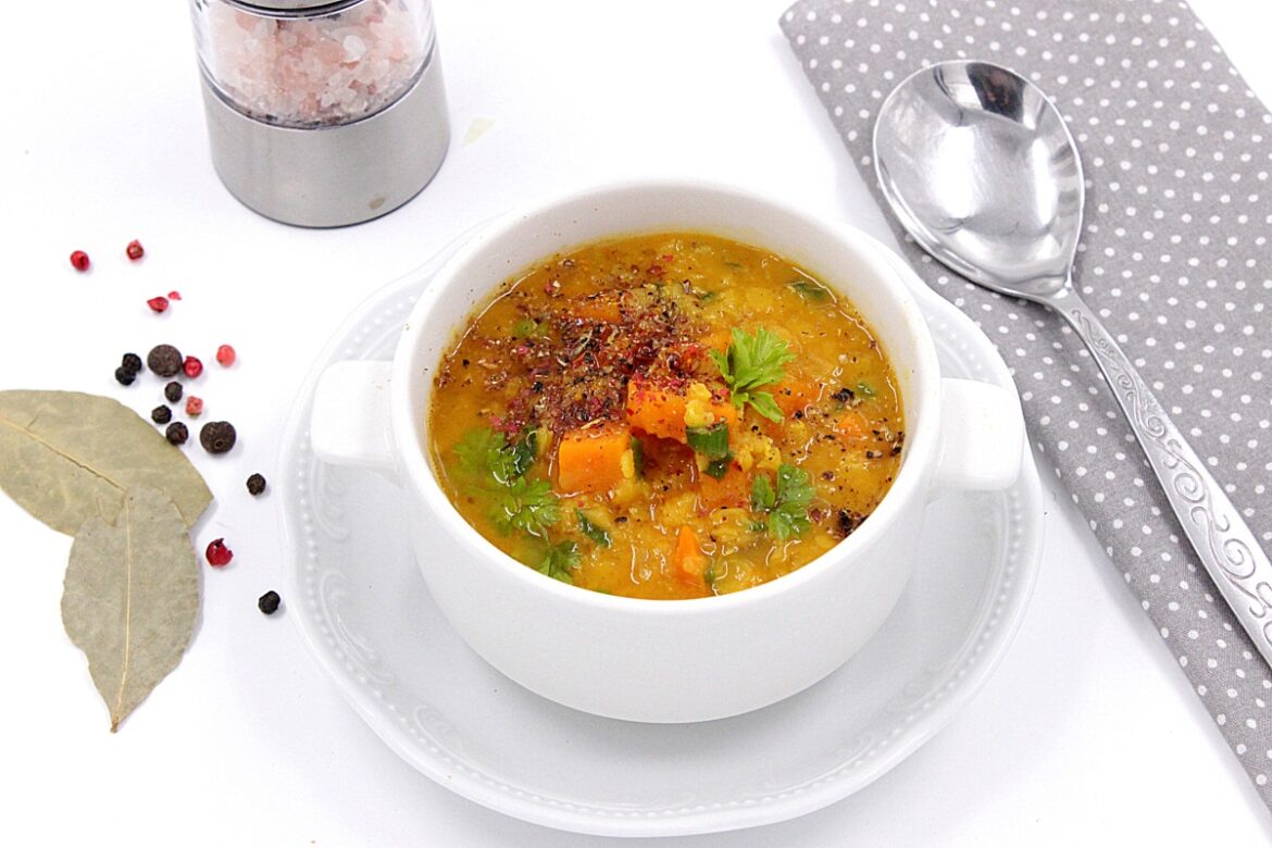 Turmeric, garlic and coconut oil will eventually give a sort of Indian note to our soup. Instead of turmeric, you can take a pinch of zira and ground coriander.