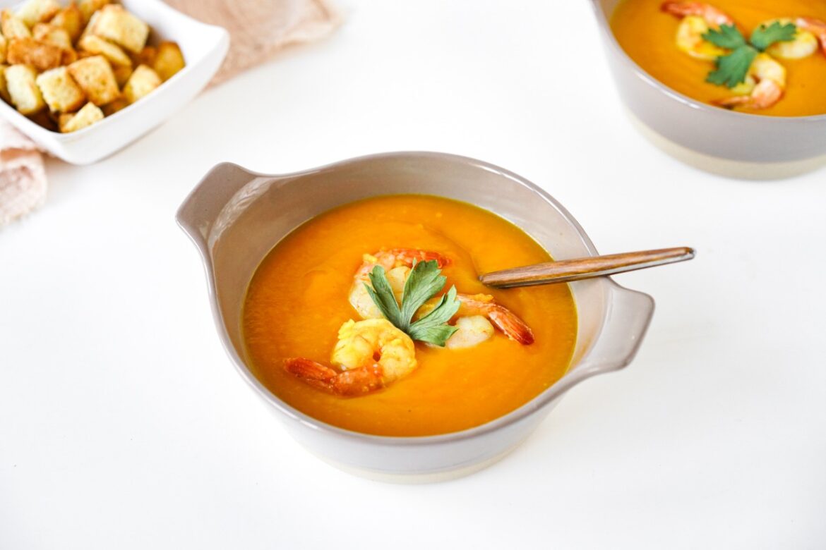 Serve the creamy soup warm; the velvety, thick and flavorful texture of the pumpkin combines with the natural sweetness of the vegetables and a hint of heat from the spices. Juicy, neatly fried shrimp add a festive maritime touch and make the plate especially elegant — ideal for a light but satisfying lunch or dinner.