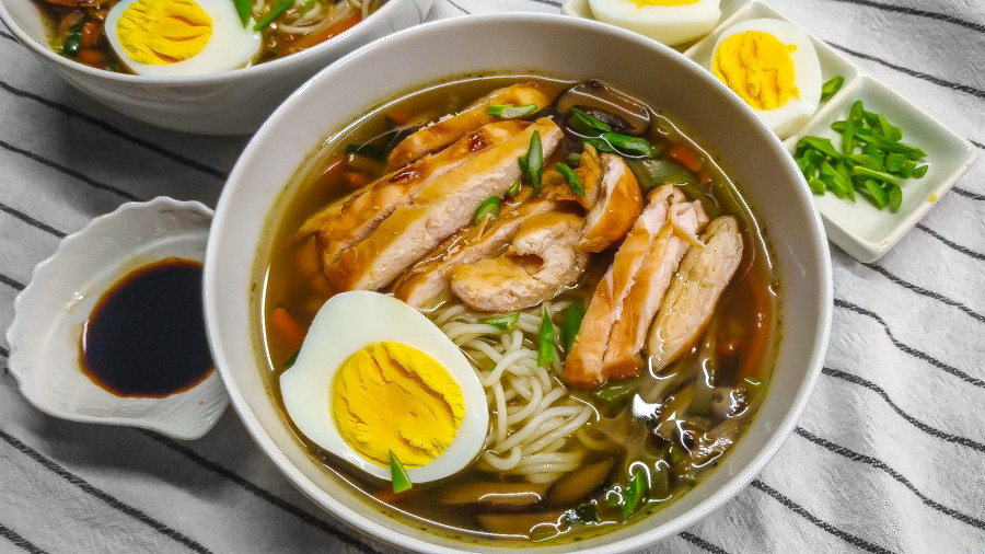 Place the noodles at the bottom of the bowl, pour in the soup, and place the chicken on top. Serve with half an egg and herbs.