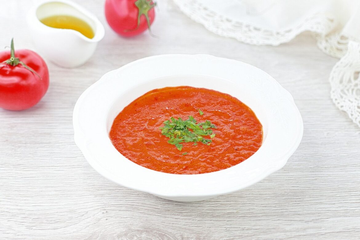 A classic tomato puree soup can be eaten both warm and cold. You can serve dried croutons, sour cream, grated parmesan and greens to the soup.