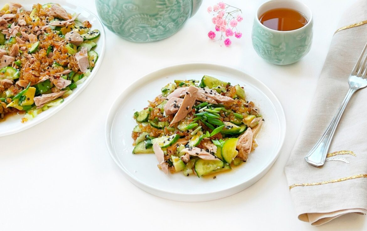 Prepare a salad dressing with avocados and tuna. Mix vegetable oil, rice vinegar, 2 teaspoons of ground ginger and soy sauce.