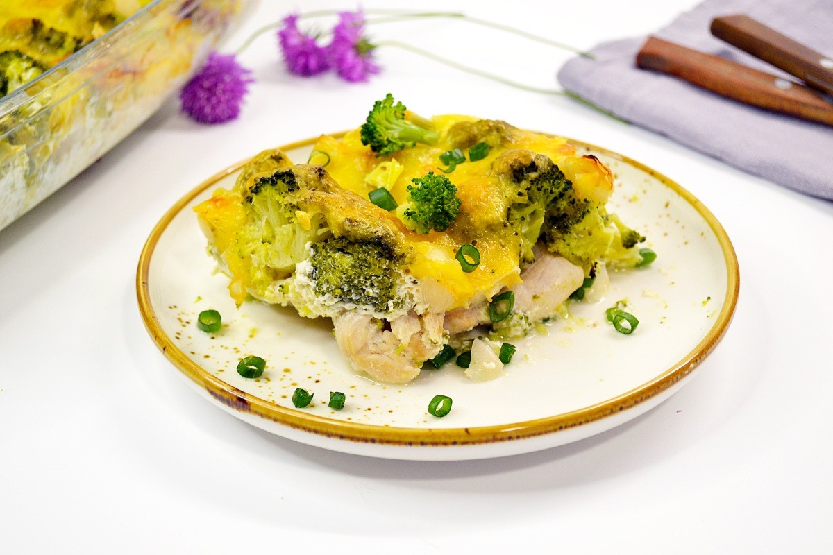 Put chicken from broccoli in a preheated oven and bake at 200 degrees 30-35 minutes. If the crust is not golden enough, add another 5-7 minutes.