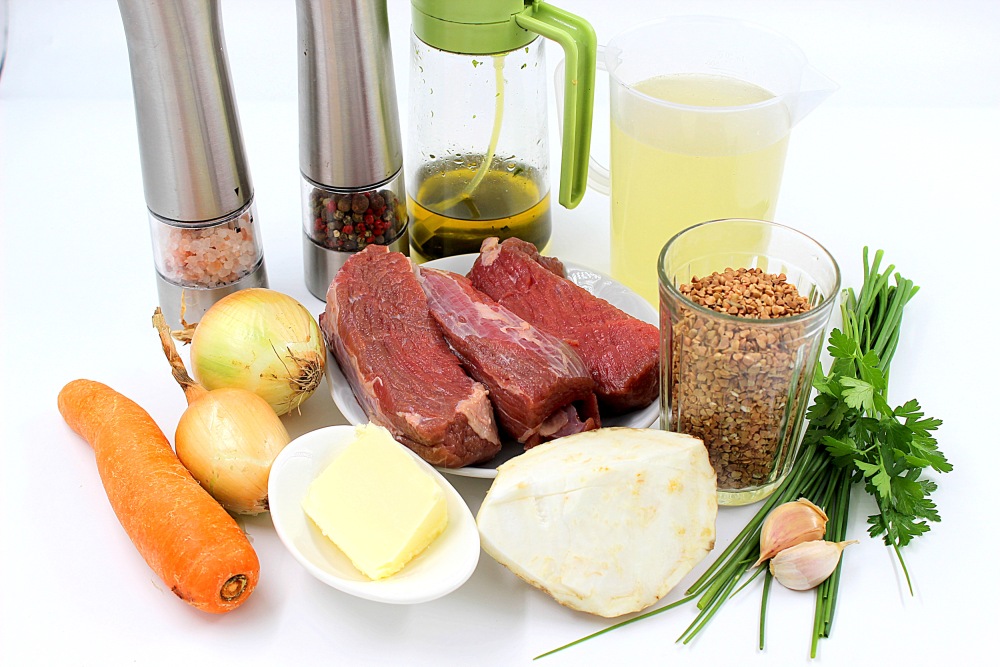 Prepare all ingredients for buckwheat with meat in a frying pan.