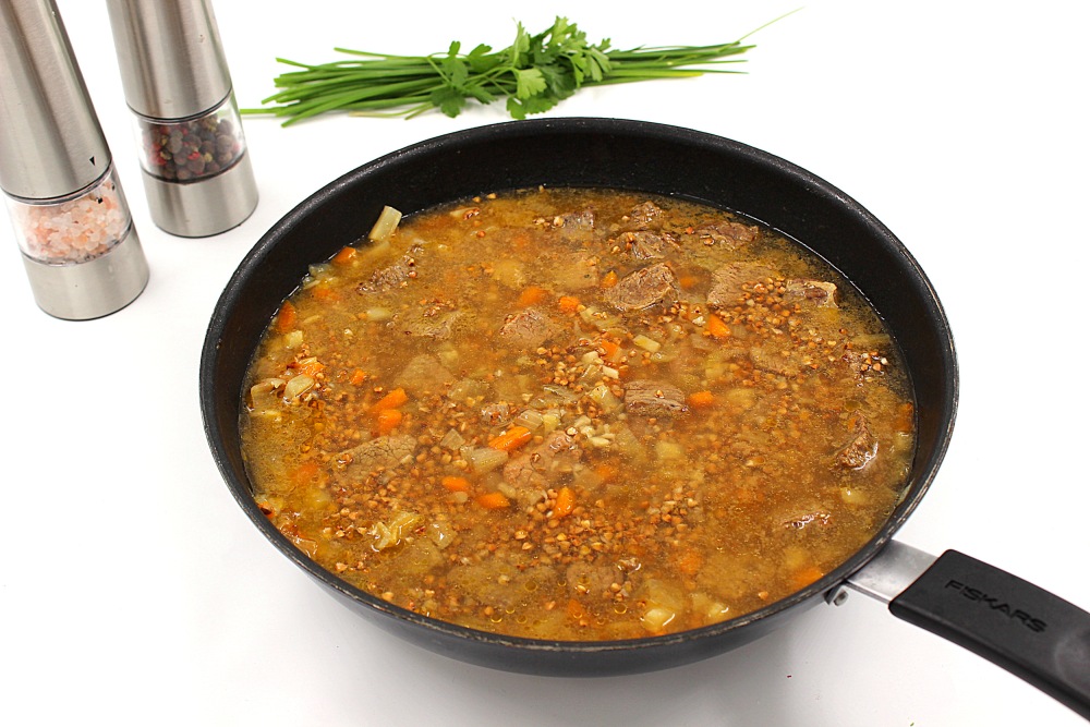 Add the second half of the broth, close the lid and cook the buckwheat with meat in a frying pan over low heat for another 15 minutes.