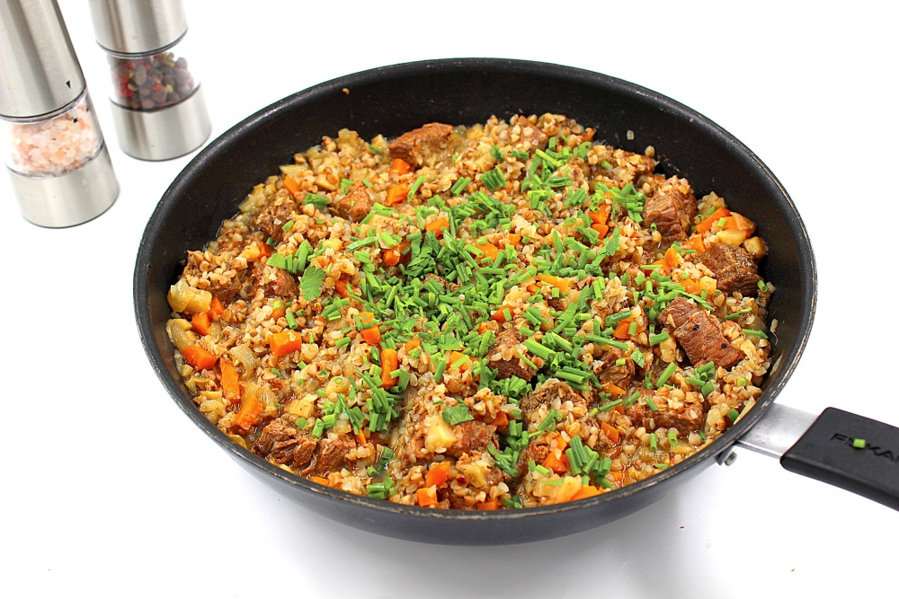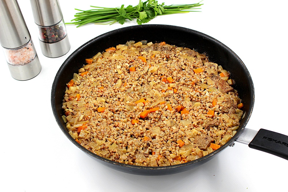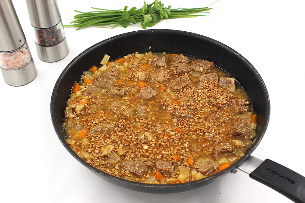 Mix everything and the buckwheat with meat in the pan is ready.