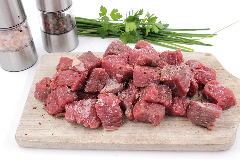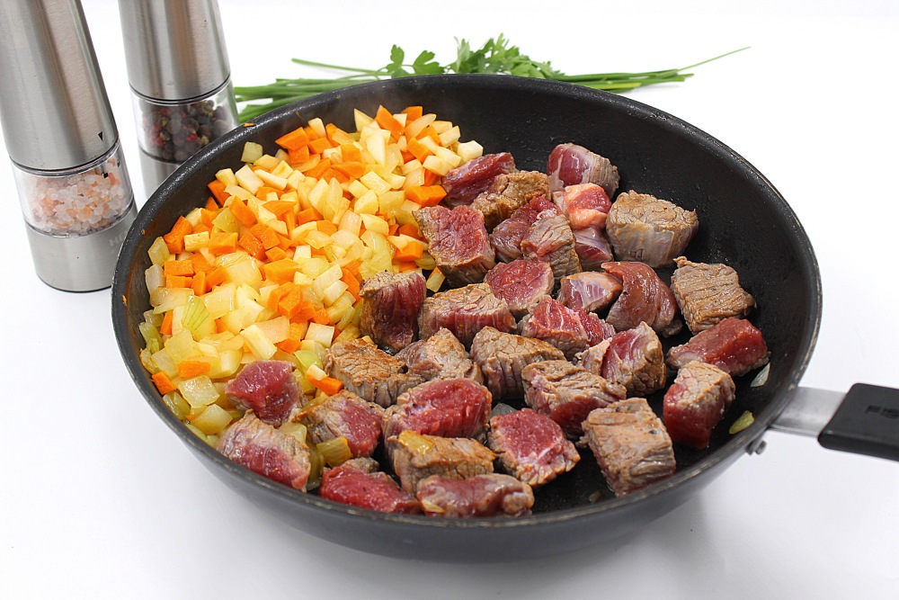Cut the beef into small pieces. Salt and pepper.