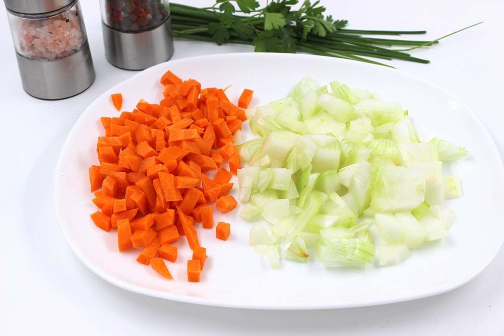 Dice the onion and carrots.