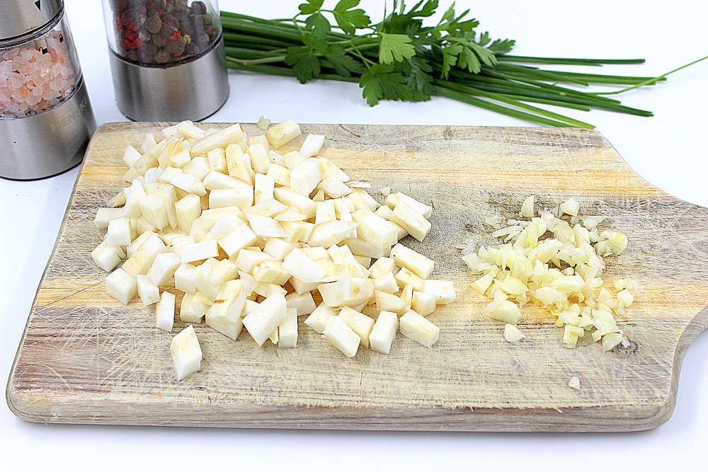 Also cut the celery into small cubes and chop the garlic.