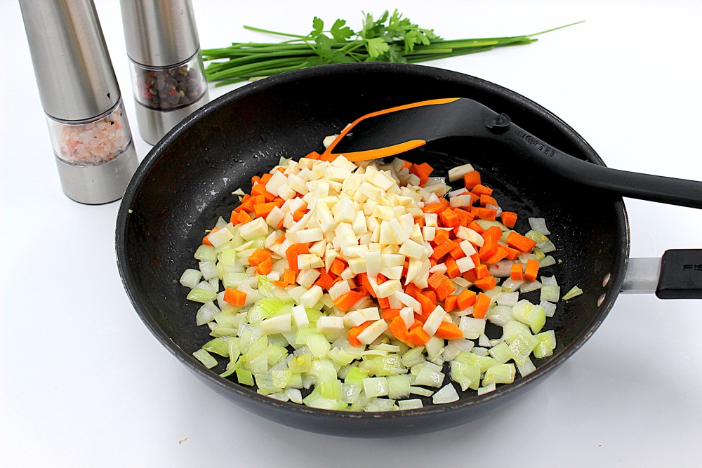 Fry onions, carrots, celery and garlic in a spoon of olive oil.