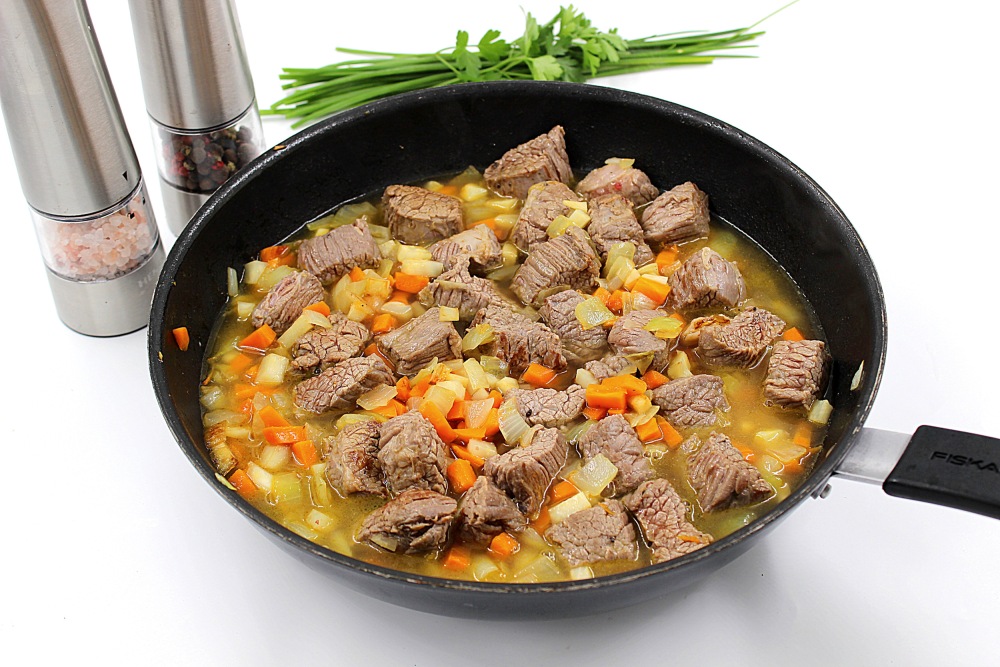 Add half the broth, close the lid and simmer the meat until soft.
