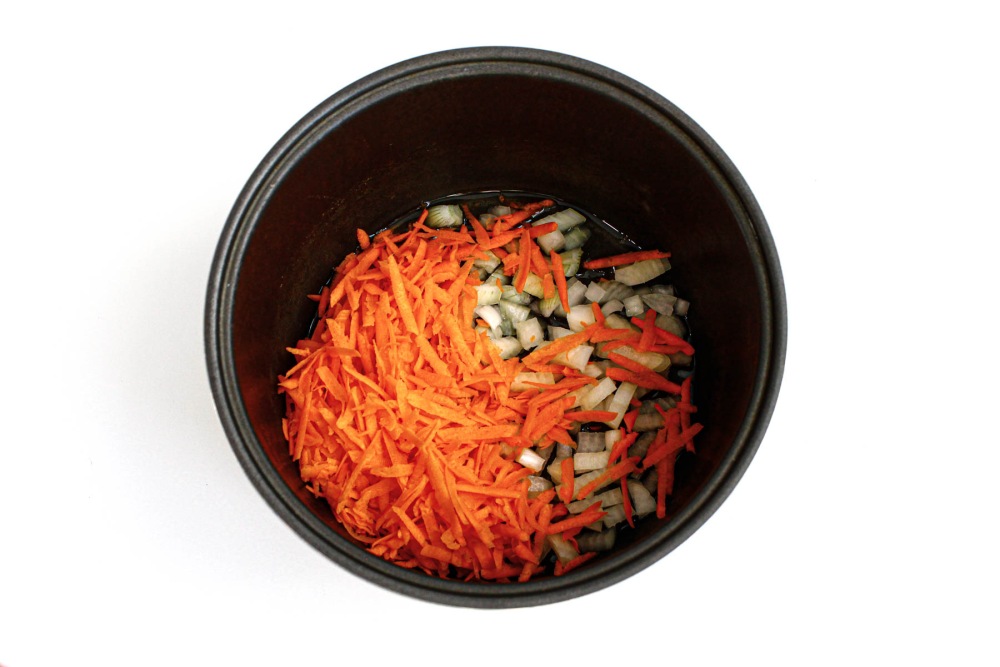 Mix onions and carrots in a bowl and fry in a slow cooker on the “fry” mode for 10 minutes. This will be enough for the bowl to warm up to the desired temperature and begin frying the vegetables.