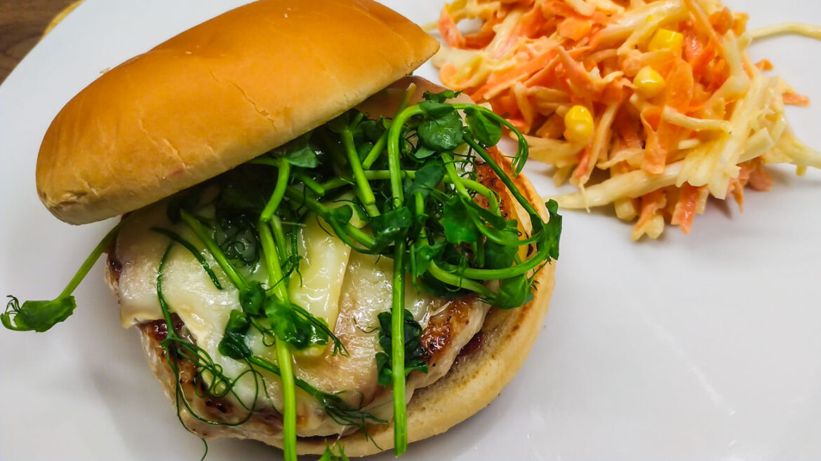 Lubricate the lower parts of the buns with lingonberry sauce, put the slices of apples, cutlets with cheese and a microwave on top.