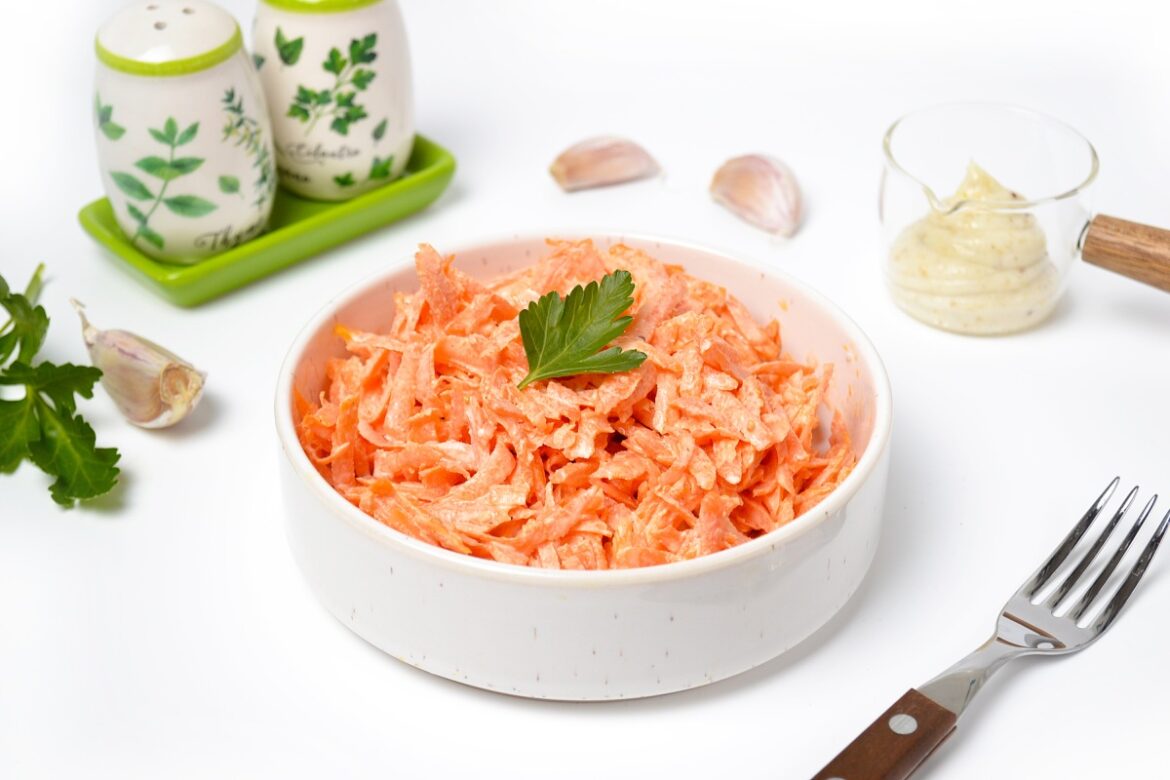 Season the salad with the resulting mayonnaise — 3-4 tbsp. l. or to taste. The remaining mayonnaise can be stored for up to 4-5 days. The carrots have already given juice, but you should not drain it.