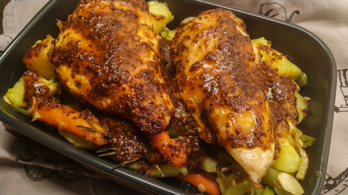 On the bottom of the form we spread the vegetables, on top of the chicken, pour it with honey-horsing sauce, send to the oven preheated to 180 ° C for 15 minutes.