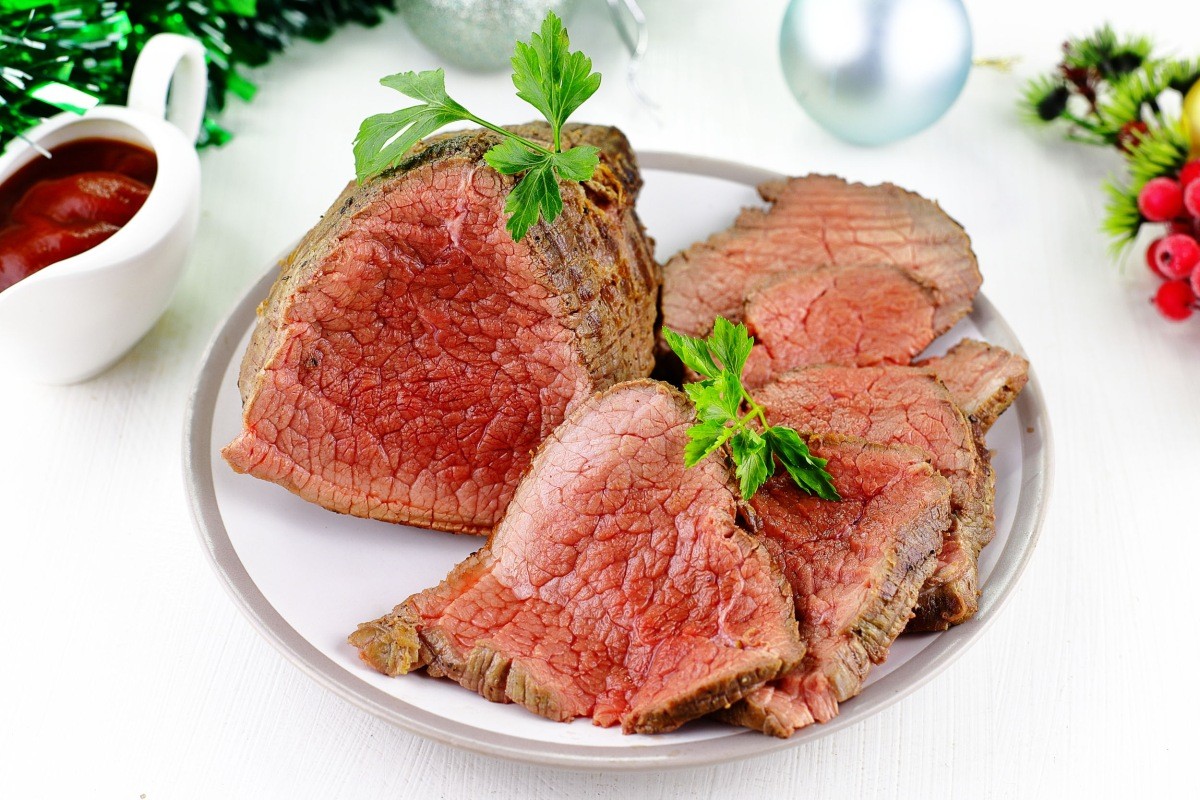 Prepare the necessary ingredients for a classic beef roast beef recipe for the holiday table. For roast beef, meat with moderate marbling is best suited — this is when thin streaks of fat can be traced between the fibers of the meat. These layers of fat melt during cooking, giving the meat juiciness and softness.