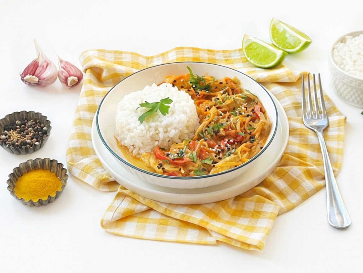While the chicken is stewing, boil the rice. Jasmine or basmati is best suited — they go well with spicy chicken carry in coconut milk. Read more, see here 👇🏻