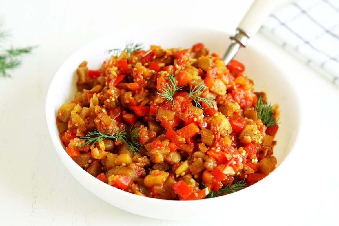 Video reception of eggplant caviar in a pan for dinner with tomatoes and pepper