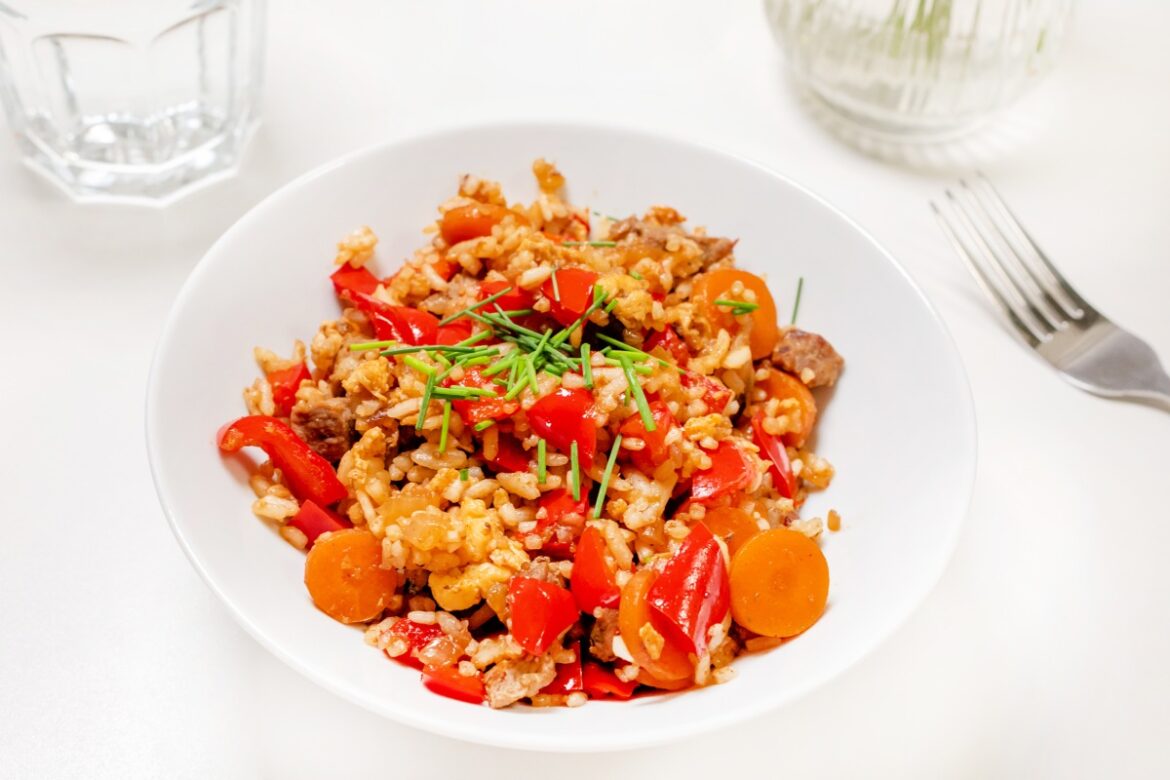 Remove the pan from the fire. Leave under the lid for a couple of minutes so that the aroma is infused a little. Lay out rice on plates, decorate with green onions if desired. The remnants of the dish can be heated the next day — rice will remain taste and aroma.