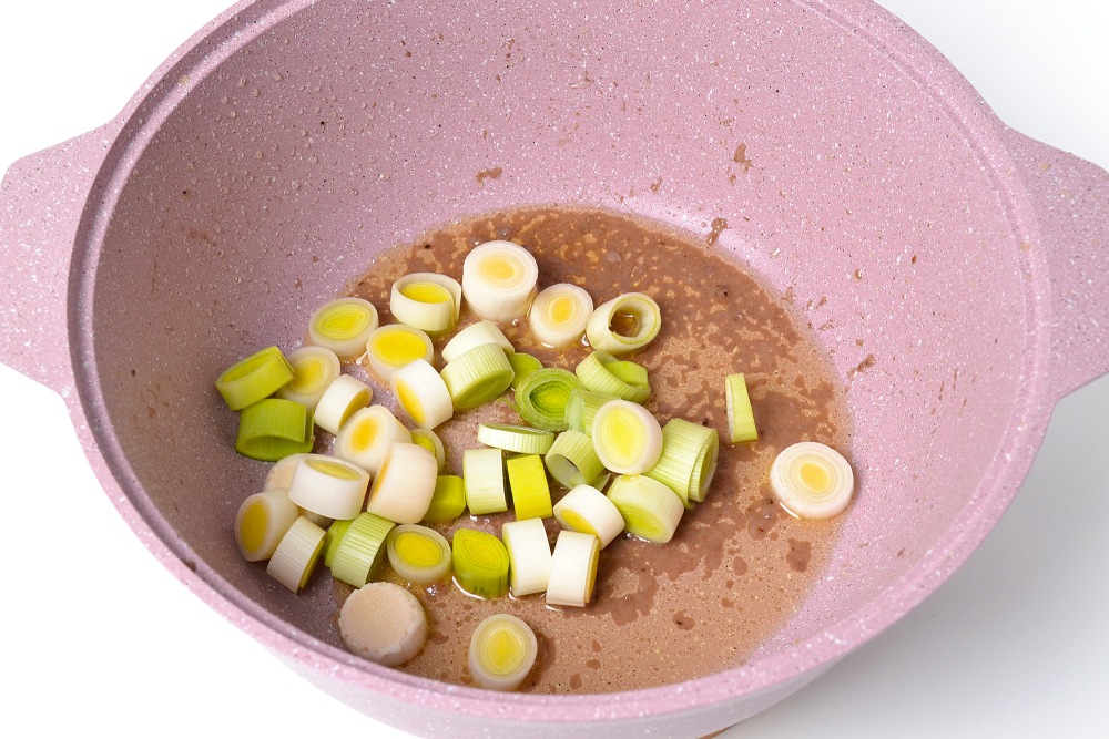Add chopped leeks to the mixture of juice and oil left after frying the meat. Fry over high heat for 3-4 minutes.