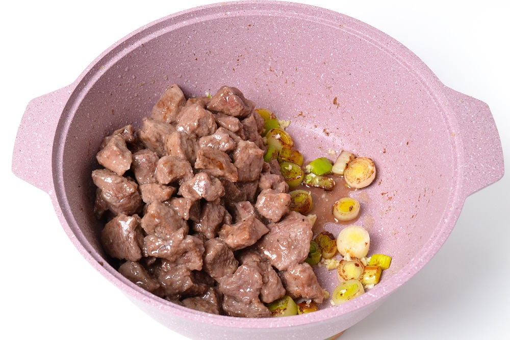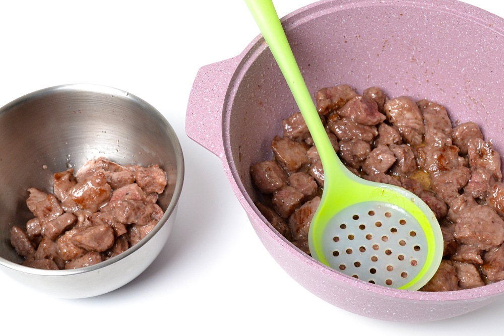 Place half of the meat in well-heated oil — in 1 layer, so that the pieces are well fried. Fry over high heat for 3-4 minutes until the color changes and the crust is light golden brown. Then transfer the meat to a separate bowl and place the second portion in the roasting pan, adding 1-2 tbsp. l. oils