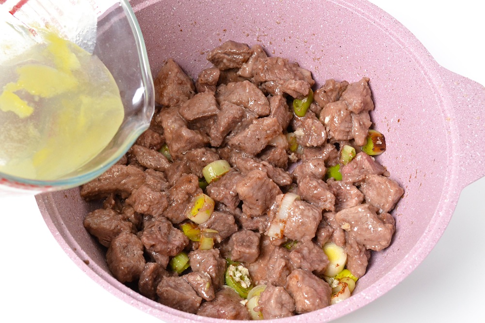 Pour in beef broth. It can be warm or room temperature — it doesn't matter.