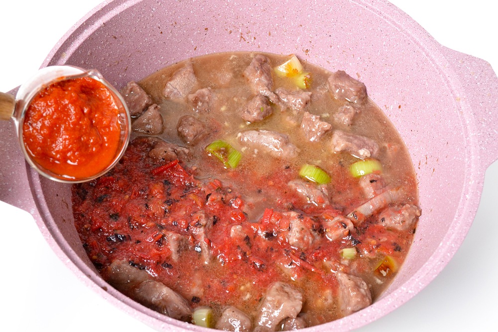 Add grated or chopped tomatoes and tomato paste to the meat and onions. Mix.