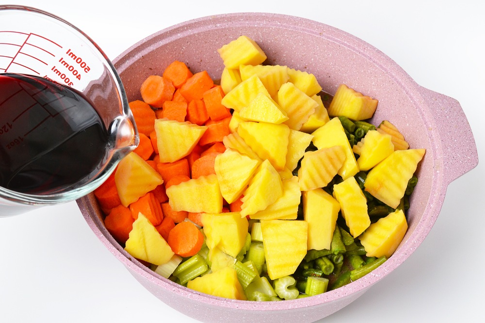 Tip: if there are brown marks on the bottom from meat and onions, mix the contents thoroughly, using a spatula to scrape off any stuck parts of the food from the bottom.