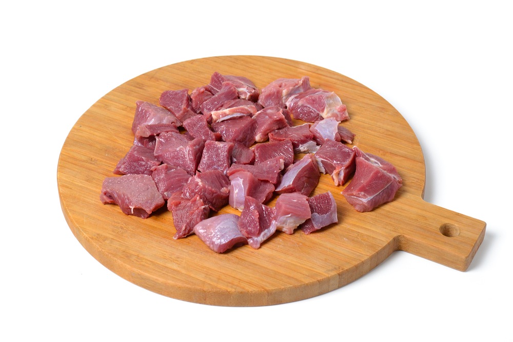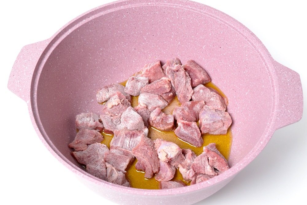 Heat 3 tbsp in a deep roasting pan (I use 4 liters, you can use 5 liters) or a non-stick pan. l. olive oil. Remove tendons from the meat and cut into 2-3 cm cubes.