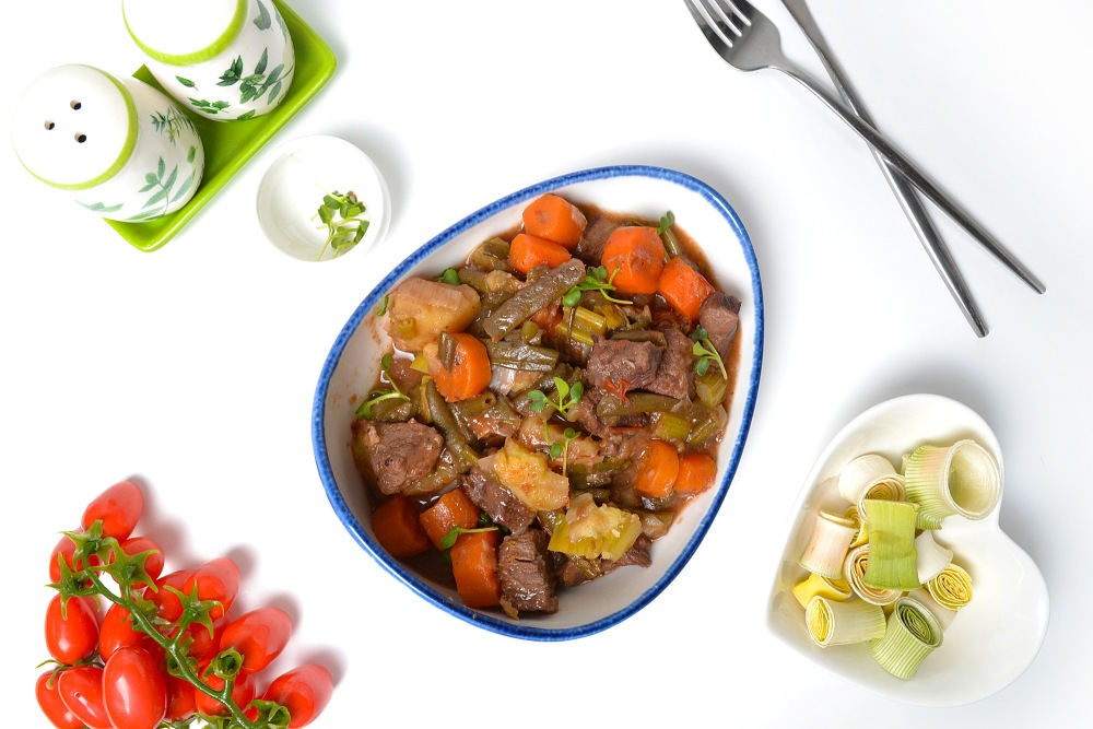 Place the finished roast beef with home-style vegetables on plates, garnish with microgreens or parsley and serve. Bon appetit!